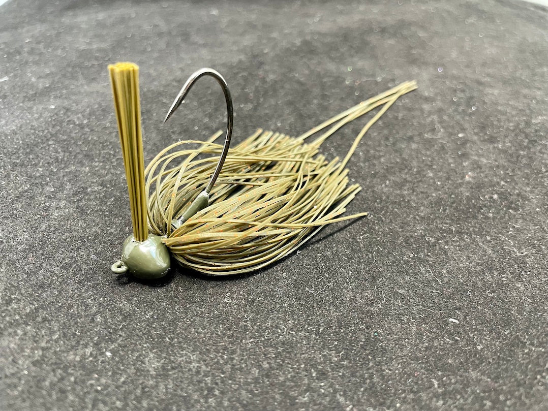 This football jig utilizes a unique custom bent Gamakatsu medium wire hook. The hook has the best of both worlds! The diameter of the hook combined with a wide gap makes this jig perform better on those long casts over open water that normally is associated with using football jigs.