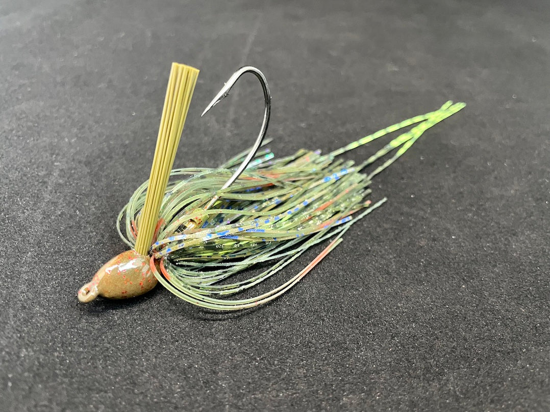 Introducing the Black Angel Swim Jig! This jig has a very unique design that allows it to be fished in the heaviest of cover without hanging up. We credit this feature to the head design. It all starts with the line tie. By using this angle and combining it with a wedge shape head, the jig will actually "plane" out under water allowing the bait to not roll onto itself while coming through heavy cover. We also use a long shank VMC hook. Most swim jigs out there are just that, "a jig." Basically, what we have made is a spinner bait with no blade. We combine these unique features with our standard hand tied skirt to make this the #1 swim jig on the market.